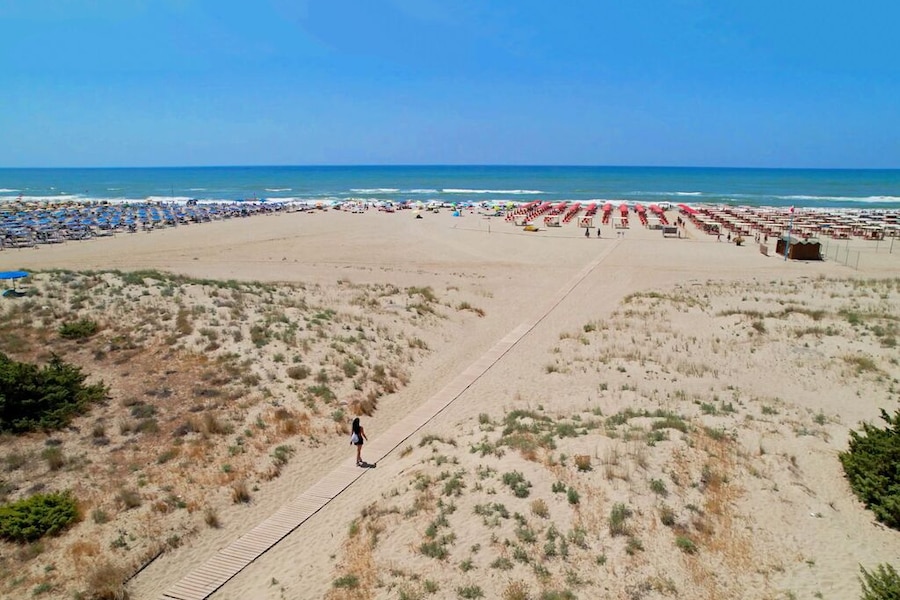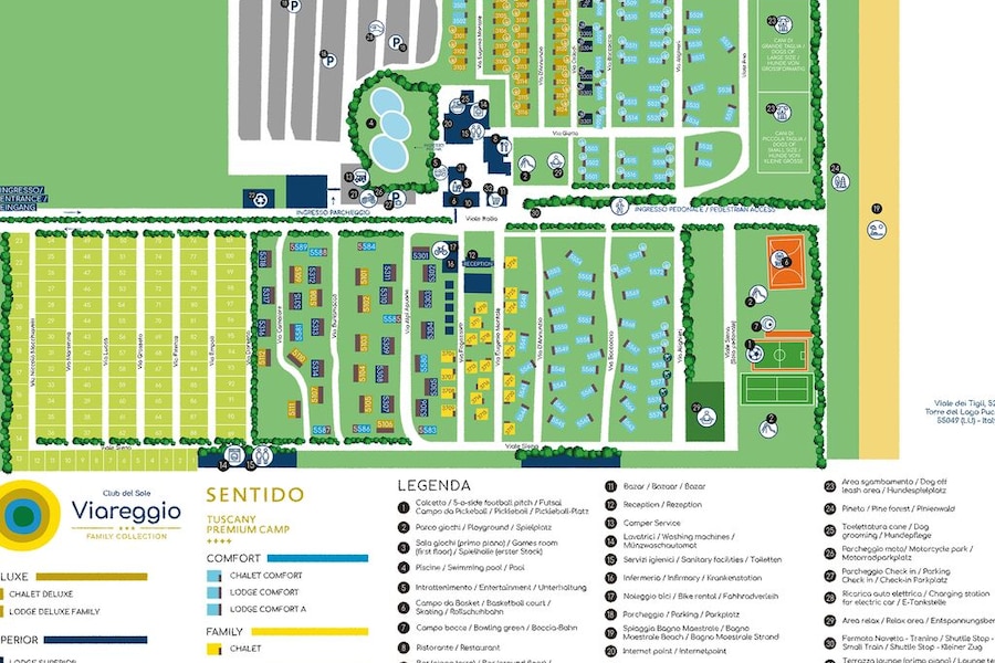 Club del Sole Viareggio Family Collection is gelegen in het pittoreske Torre del Lago Puccini. Dít is de regio die je te binnen schiet wanneer je aan Toscane denkt, met glooiende groene heuvels, prachtige historische steden en fijne stranden. Een van deze stranden ligt op slechts één kilometer lopen vanaf de camping. Na je ontspannen wandeling strijk je neer op je strandhanddoek of neem je plek op een strandbedje onder een parasol.